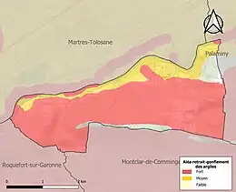 La commune est vulnérable au risque de mouvements de terrains constitué principalement du retrait-gonflement des sols argileux[37]. Cet aléa est susceptible d'engendrer des dommages importants aux bâtiments en cas d’alternance de périodes de sécheresse et de pluie. 93 % de la superficie communale est en aléa moyen ou fort (88,8 % au niveau départemental et 48,5 % au niveau national). Sur les 100 bâtiments dénombrés sur la commune en 2019, 99 sont en aléa moyen ou fort, soit 99 %, à comparer aux 98 % au niveau départemental et 54 % au niveau national. Une cartographie de l'exposition du territoire national au retrait gonflement des sols argileux est disponible sur le site du BRGM[38],[Carte 3].