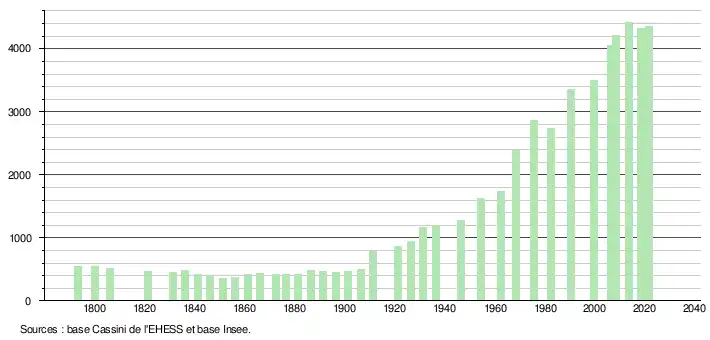 L'évolution du nombre d'habitants est connue à travers les recensements de la population effectués dans la commune depuis 1793. Pour les communes de moins de 10 000 habitants, une enquête de recensement portant sur toute la population est réalisée tous les cinq ans, les populations légales des années intermédiaires étant quant à elles estimées par interpolation ou extrapolation[23]. Pour la commune, le premier recensement exhaustif entrant dans le cadre du nouveau dispositif a été réalisé en 2008[24].