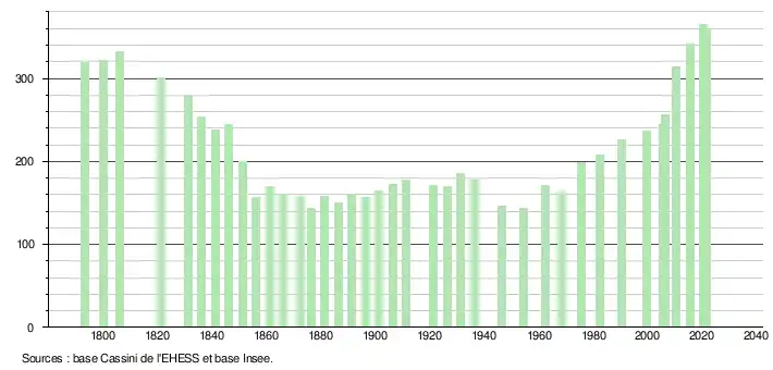 L'évolution du nombre d'habitants est connue à travers les recensements de la population effectués dans la commune depuis 1793. Pour les communes de moins de 10 000 habitants, une enquête de recensement portant sur toute la population est réalisée tous les cinq ans, les populations légales des années intermédiaires étant quant à elles estimées par interpolation ou extrapolation[34]. Pour la commune, le premier recensement exhaustif entrant dans le cadre du nouveau dispositif a été réalisé en 2005[35].