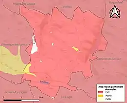 La commune est vulnérable au risque de mouvements de terrains constitué principalement du retrait-gonflement des sols argileux[23]. Cet aléa est susceptible d'engendrer des dommages importants aux bâtiments en cas d’alternance de périodes de sécheresse et de pluie. 98,9 % de la superficie communale est en aléa moyen ou fort (76,3 % au niveau départemental et 48,5 % au niveau national). Sur les 68 bâtiments dénombrés sur la commune en 2019, 68 sont en aléa moyen ou fort, soit 100 %, à comparer aux 90 % au niveau départemental et 54 % au niveau national. Une cartographie de l'exposition du territoire national au retrait gonflement des sols argileux est disponible sur le site du BRGM[24],[Carte 3].