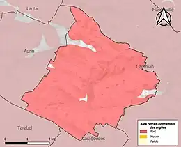 Le retrait-gonflement des sols argileux est susceptible d'engendrer des dommages importants aux bâtiments en cas d’alternance de périodes de sécheresse et de pluie. 97 % de la superficie communale est en aléa moyen ou fort (88,8 % au niveau départemental et 48,5 % au niveau national). Sur les 121 bâtiments dénombrés sur la commune en 2019, 121 sont en aléa moyen ou fort, soit 100 %, à comparer aux 98 % au niveau départemental et 54 % au niveau national. Une cartographie de l'exposition du territoire national au retrait gonflement des sols argileux est disponible sur le site du BRGM[26],[Carte 3].