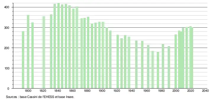 L'évolution du nombre d'habitants est connue à travers les recensements de la population effectués dans la commune depuis 1793. Pour les communes de moins de 10 000 habitants, une enquête de recensement portant sur toute la population est réalisée tous les cinq ans, les populations légales des années intermédiaires étant quant à elles estimées par interpolation ou extrapolation[30]. Pour la commune, le premier recensement exhaustif entrant dans le cadre du nouveau dispositif a été réalisé en 2004[31].