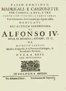 Maurizio Cazzati, né en à Luzzara (duché de Guastalla) et mort le à Mantoue, est un organiste et un prolifique compositeur italien du XVIIe siècle. Sa musique instrumentale marque de façon décisive l’école de Bologne, dont il est le fondateur.