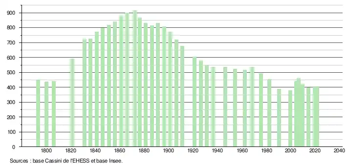 L'évolution du nombre d'habitants est connue à travers les recensements de la population effectués dans la commune depuis 1793. Pour les communes de moins de 10 000 habitants, une enquête de recensement portant sur toute la population est réalisée tous les cinq ans, les populations légales des années intermédiaires étant quant à elles estimées par interpolation ou extrapolation[18]. Pour la commune, le premier recensement exhaustif entrant dans le cadre du nouveau dispositif a été réalisé en 2004[19].
