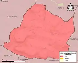 Le retrait-gonflement des sols argileux est susceptible d'engendrer des dommages importants aux bâtiments en cas d’alternance de périodes de sécheresse et de pluie. La totalité de la commune est en aléa moyen ou fort (94,5 % au niveau départemental et 48,5 % au niveau national). Sur les 102 bâtiments dénombrés sur la commune en 2019, 102 sont en aléa moyen ou fort, soit 100 %, à comparer aux 93 % au niveau départemental et 54 % au niveau national. Une cartographie de l'exposition du territoire national au retrait gonflement des sols argileux est disponible sur le site du BRGM[17],[Carte 3].