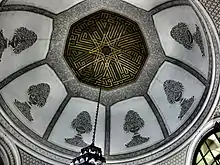 L'accès au monument se fait par un portail constitué d'un arc en plein cintre surbaissé reposant sur deux piédroits. Cette entrée ouvre sur un vestibule couvert en voûte d'arêtes qui comporte des portes encadrées de plaques en grès desservant cinq pièces destinées aux visiteurs[2]. Le vestibule mène à une salle, formant un espace intermédiaire surmonté d'une imposante coupole, qui précède la chambre funéraire[2].