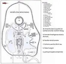 Le tombeau de l'empereur Minh Mang est un ensemble architectural comptant 40 monuments (palais, pavillons, temples, etc.) disposés symétriquement sur un axe allant de la Porte Dai Hong jusqu'au pied du mur d’enceinte La Thanh, derrière le tombeau royal.