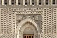 Les détails décoratifs sont réalisés en brique ou en gypse sculpté et dans des volumes réduits[30]. Les briques sont posées de manière alternée : couchées à l'horizontale puis verticalement, ou encore en chevron. Elles sont également utilisées pour former des séries de petites rosaces juxtaposées. Placées sur un fond profond en maçonnerie elles permettent d'organiser avec virtuosité un jeu d'ombre et de lumière dont on ne retrouve pas d'équivalent dans les monuments d'architecture de cette époque[31].