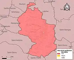 Le retrait-gonflement des sols argileux est susceptible d'engendrer des dommages importants aux bâtiments en cas d’alternance de périodes de sécheresse et de pluie. La totalité de la commune est en aléa moyen ou fort (94,5 % au niveau départemental et 48,5 % au niveau national). Sur les 1 076 bâtiments dénombrés sur la commune en 2019, 1 065 sont en aléa moyen ou fort, soit 99 %, à comparer aux 93 % au niveau départemental et 54 % au niveau national. Une cartographie de l'exposition du territoire national au retrait gonflement des sols argileux est disponible sur le site du BRGM[25],[Carte 3].