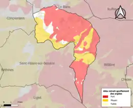 Le retrait-gonflement des sols argileux est susceptible d'engendrer des dommages importants aux bâtiments en cas d’alternance de périodes de sécheresse et de pluie. 91,2 % de la superficie communale est en aléa moyen ou fort (84,7 % au niveau départemental et 48,5 % au niveau national). Sur les 226 bâtiments dénombrés sur la commune en 2019, 214 sont en aléa moyen ou fort, soit 95 %, à comparer aux 86 % au niveau départemental et 54 % au niveau national. Une cartographie de l'exposition du territoire national au retrait gonflement des sols argileux est disponible sur le site du BRGM[21],[22].