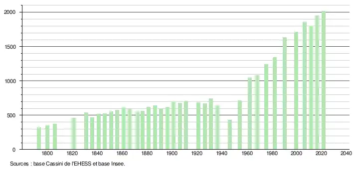 L'évolution du nombre d'habitants est connue à travers les recensements de la population effectués dans la commune depuis 1793. Pour les communes de moins de 10 000 habitants, une enquête de recensement portant sur toute la population est réalisée tous les cinq ans, les populations légales des années intermédiaires étant quant à elles estimées par interpolation ou extrapolation[26]. Pour la commune, le premier recensement exhaustif entrant dans le cadre du nouveau dispositif a été réalisé en 2006[27].