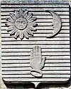 D'azur à la main appaumée d'argent, accompagnée en chef à dextre d'un soleil d'or et à senestre d'une lune aussi d'argent. |