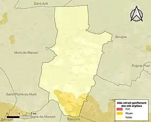 Le retrait-gonflement des sols argileux est susceptible d'engendrer des dommages importants aux bâtiments en cas d’alternance de périodes de sécheresse et de pluie. 11 % de la superficie communale est en aléa moyen ou fort (19,2 % au niveau départemental et 48,5 % au niveau national). Sur les 294 bâtiments dénombrés sur la commune en 2019, 22 sont en aléa moyen ou fort, soit 7 %, à comparer aux 17 % au niveau départemental et 54 % au niveau national. Une cartographie de l'exposition du territoire national au retrait gonflement des sols argileux est disponible sur le site du BRGM[21],[Carte 2].