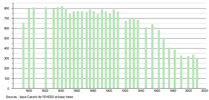 L'évolution du nombre d'habitants est connue à travers les recensements de la population effectués dans la commune depuis 1793. À partir du , les populations légales des communes sont publiées annuellement dans le cadre d'un recensement qui repose désormais sur une collecte d'information annuelle, concernant successivement tous les territoires communaux au cours d'une période de cinq ans. Pour les communes de moins de 10 000 habitants, une enquête de recensement portant sur toute la population est réalisée tous les cinq ans, les populations légales des années intermédiaires étant quant à elles estimées par interpolation ou extrapolation[25]. Pour la commune, le premier recensement exhaustif entrant dans le cadre du nouveau dispositif a été réalisé en 2005[26],[Note 1].