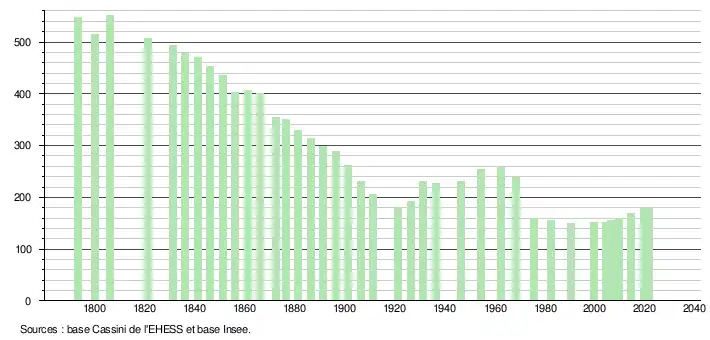 L'évolution du nombre d'habitants est connue à travers les recensements de la population effectués dans la commune depuis 1793. Pour les communes de moins de 10 000 habitants, une enquête de recensement portant sur toute la population est réalisée tous les cinq ans, les populations légales des années intermédiaires étant quant à elles estimées par interpolation ou extrapolation[24]. Pour la commune, le premier recensement exhaustif entrant dans le cadre du nouveau dispositif a été réalisé en 2004[25].