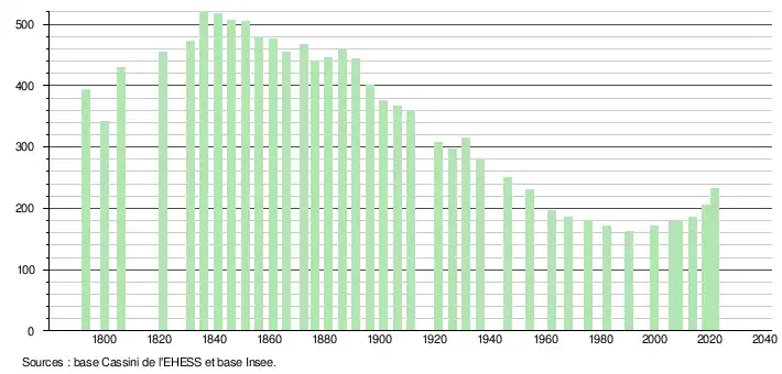 L'évolution du nombre d'habitants est connue à travers les recensements de la population effectués dans la commune depuis 1793. Pour les communes de moins de 10 000 habitants, une enquête de recensement portant sur toute la population est réalisée tous les cinq ans, les populations légales des années intermédiaires étant quant à elles estimées par interpolation ou extrapolation[17]. Pour la commune, le premier recensement exhaustif entrant dans le cadre du nouveau dispositif a été réalisé en 2008[18].