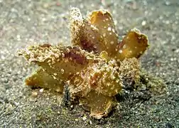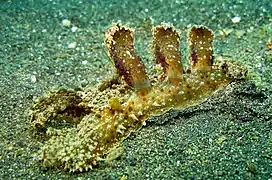 La tête est composée d'un grand voile translucide, en forme de ventouse, bordé de papilles sensitives qui lui permettent de détecter sa nourriture. En phase de recherche de nourriture, l'animal rampe en analysant la surface du sol avec son voile déployé, s'il trouve de la nourriture il referme son voile en rassemblant les deux faces latérales de ce dernier.