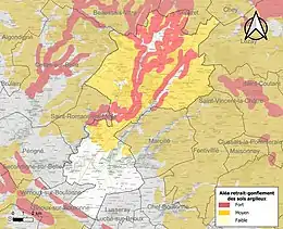 Les mouvements de terrains susceptibles de se produire sur la commune sont des tassements différentiels[19]. Le retrait-gonflement des sols argileux est susceptible d'engendrer des dommages importants aux bâtiments en cas d’alternance de périodes de sécheresse et de pluie[20]. 68,3 % de la superficie communale est en aléa moyen ou fort (54,9 % au niveau départemental et 48,5 % au niveau national)[21]. Depuis le , en application de la loi ELAN, différentes contraintes s'imposent aux vendeurs, maîtres d'ouvrages ou constructeurs de biens situés dans une zone classée en aléa moyen ou fort[Note 6],[22].