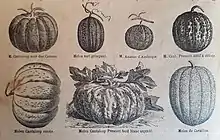 Ces melons se distinguent par leur forme (ronde, ovoïde, elliptique), par leur couleur (blanche, jaune crème, verte, ocre…), par l'aspect de leur surface (sillons[alpha 2], broderies[alpha 3], plis), par la présence ou non d'un pédoncule déhiscent :