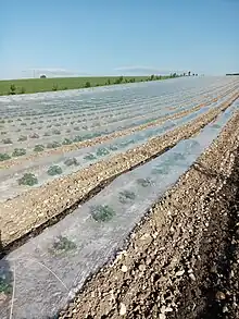 En général, ces cultures sont conduites sur billon léger et sous mini-tunnels maraîchers (appelés chenilles) pour les premières semaines de culture avec des melons de type charentais car la température du sol doit être au moins de 15 °C. La mécanisation permet d'ajuster les charges : la même machine billonne, pose le système d'irrigation goutte-à-goutte et le plastique transparent de la chenille (video[11]). Les melons sont plutôt semés que plantés et la fertilisation complémentaire est délivrée par le système d'irrigation (fertirrigation)[14]. Les chenilles sont relevées par d'autres machines. La taille est réalisée par écimage mécanique. La récolte, poste important, est réalisée manuellement mais assistée par des machines assurant notamment la disponibilité et le cheminement des palox (caisses palettisées).