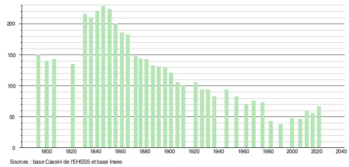 L'évolution du nombre d'habitants est connue à travers les recensements de la population effectués dans la commune depuis 1793. Pour les communes de moins de 10 000 habitants, une enquête de recensement portant sur toute la population est réalisée tous les cinq ans, les populations légales des années intermédiaires étant quant à elles estimées par interpolation ou extrapolation[15]. Pour la commune, le premier recensement exhaustif entrant dans le cadre du nouveau dispositif a été réalisé en 2006[16].