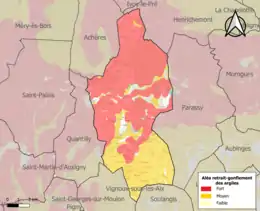 La commune est vulnérable au risque de mouvements de terrains constitué principalement du retrait-gonflement des sols argileux[16]. Cet aléa est susceptible d'engendrer des dommages importants aux bâtiments en cas d’alternance de périodes de sécheresse et de pluie. 93,7 % de la superficie communale est en aléa moyen ou fort (90 % au niveau départemental et 48,5 % au niveau national). Sur les 878 bâtiments dénombrés sur la commune en 2019, 746 sont en aléa moyen ou fort, soit 85 %, à comparer aux 83 % au niveau départemental et 54 % au niveau national. Une cartographie de l'exposition du territoire national au retrait gonflement des sols argileux est disponible sur le site du BRGM[17],[Carte 2].