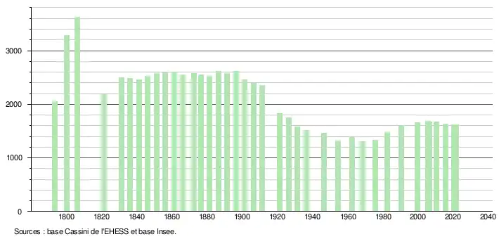 L'évolution du nombre d'habitants est connue à travers les recensements de la population effectués dans la commune depuis 1793. Pour les communes de moins de 10 000 habitants, une enquête de recensement portant sur toute la population est réalisée tous les cinq ans, les populations légales des années intermédiaires étant quant à elles estimées par interpolation ou extrapolation[25]. Pour la commune, le premier recensement exhaustif entrant dans le cadre du nouveau dispositif a été réalisé en 2005[26].