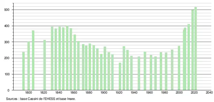 L'évolution du nombre d'habitants est connue à travers les recensements de la population effectués dans la commune depuis 1793. Pour les communes de moins de 10 000 habitants, une enquête de recensement portant sur toute la population est réalisée tous les cinq ans, les populations légales des années intermédiaires étant quant à elles estimées par interpolation ou extrapolation[6]. Pour la commune, le premier recensement exhaustif entrant dans le cadre du nouveau dispositif a été réalisé en 2007[7].