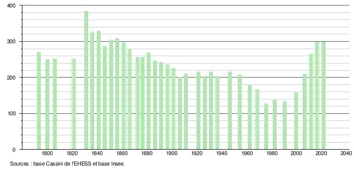 L'évolution du nombre d'habitants est connue à travers les recensements de la population effectués dans la commune depuis 1793. Pour les communes de moins de 10 000 habitants, une enquête de recensement portant sur toute la population est réalisée tous les cinq ans, les populations légales des années intermédiaires étant quant à elles estimées par interpolation ou extrapolation[21]. Pour la commune, le premier recensement exhaustif entrant dans le cadre du nouveau dispositif a été réalisé en 2006[22].