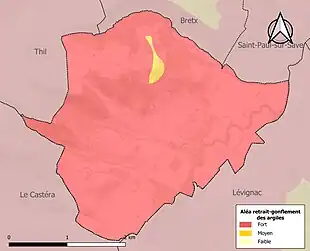 Le retrait-gonflement des sols argileux est susceptible d'engendrer des dommages importants aux bâtiments en cas d’alternance de périodes de sécheresse et de pluie. La totalité de la commune est en aléa moyen ou fort (88,8 % au niveau départemental et 48,5 % au niveau national). Sur les 290 bâtiments dénombrés sur la commune en 2019, 290 sont en aléa moyen ou fort, soit 100 %, à comparer aux 98 % au niveau départemental et 54 % au niveau national. Une cartographie de l'exposition du territoire national au retrait gonflement des sols argileux est disponible sur le site du BRGM[25],[Carte 3].