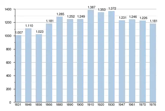 Les chiffres des années 1831 à 1970 tiennent compte des chiffres des anciennes communes fusionnées.