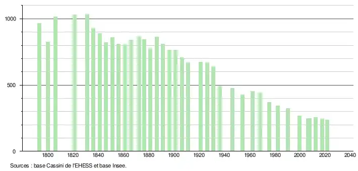 L'évolution du nombre d'habitants est connue à travers les recensements de la population effectués dans la commune depuis 1793. Pour les communes de moins de 10 000 habitants, une enquête de recensement portant sur toute la population est réalisée tous les cinq ans, les populations légales des années intermédiaires étant quant à elles estimées par interpolation ou extrapolation[23]. Pour la commune, le premier recensement exhaustif entrant dans le cadre du nouveau dispositif a été réalisé en 2007[24].