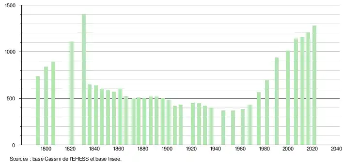 L'évolution du nombre d'habitants est connue à travers les recensements de la population effectués dans la commune depuis 1793. Pour les communes de moins de 10 000 habitants, une enquête de recensement portant sur toute la population est réalisée tous les cinq ans, les populations légales des années intermédiaires étant quant à elles estimées par interpolation ou extrapolation[21]. Pour la commune, le premier recensement exhaustif entrant dans le cadre du nouveau dispositif a été réalisé en 2006[22].