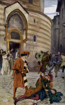 Mais Roméo reçoit des menaces de mort de Tybalt, cousin de Juliette ; il refuse cependant de se battre avec lui. Mercutio, irrité par son attitude, décide de se battre lui-même contre Tybalt. Une malencontreuse intervention de Roméo provoque la mort de Mercutio qui reçoit un coup de couteau de son adversaire.