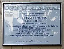 Meret Elisabeth Oppenheim, née le à Berlin-Charlottenburg et morte le à Bâle, est une écrivaine, artiste peintre, photographe et plasticienne suisse.