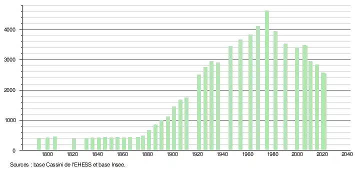 - Population municipale légale en vigueur au 1er janvier 2024, millésimée 2021, définie dans les limites territoriales en vigueur au 1er janvier 2023, date de référence statistique : 1er janvier 2021.
