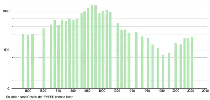 L'évolution du nombre d'habitants est connue à travers les recensements de la population effectués dans la commune depuis 1793. Pour les communes de moins de 10 000 habitants, une enquête de recensement portant sur toute la population est réalisée tous les cinq ans, les populations légales des années intermédiaires étant quant à elles estimées par interpolation ou extrapolation[35]. Pour la commune, le premier recensement exhaustif entrant dans le cadre du nouveau dispositif a été réalisé en 2006[36].