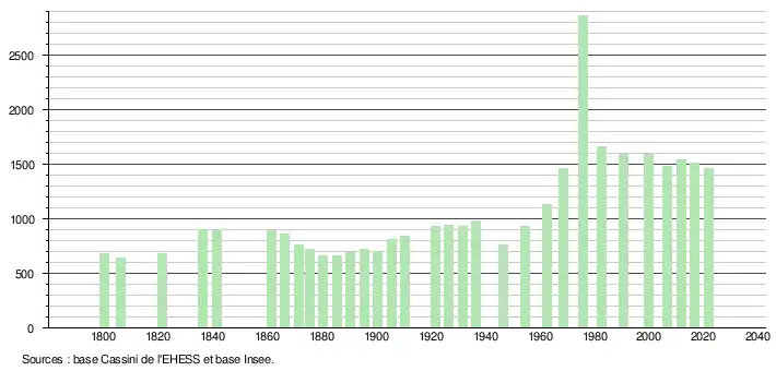 L'évolution du nombre d'habitants est connue à travers les recensements de la population effectués dans la commune depuis 1800. Pour les communes de moins de 10 000 habitants, une enquête de recensement portant sur toute la population est réalisée tous les cinq ans, les populations légales des années intermédiaires étant quant à elles estimées par interpolation ou extrapolation[12]. Pour la commune, le premier recensement exhaustif entrant dans le cadre du nouveau dispositif a été réalisé en 2006[13].