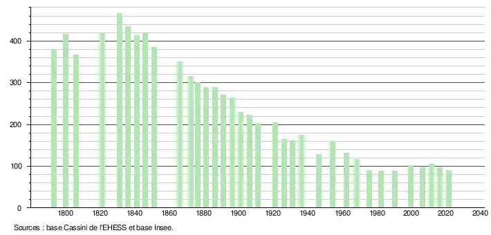 L'évolution du nombre d'habitants est connue à travers les recensements de la population effectués dans la commune depuis 1793. Pour les communes de moins de 10 000 habitants, une enquête de recensement portant sur toute la population est réalisée tous les cinq ans, les populations légales des années intermédiaires étant quant à elles estimées par interpolation ou extrapolation[17]. Pour la commune, le premier recensement exhaustif entrant dans le cadre du nouveau dispositif a été réalisé en 2006[18].