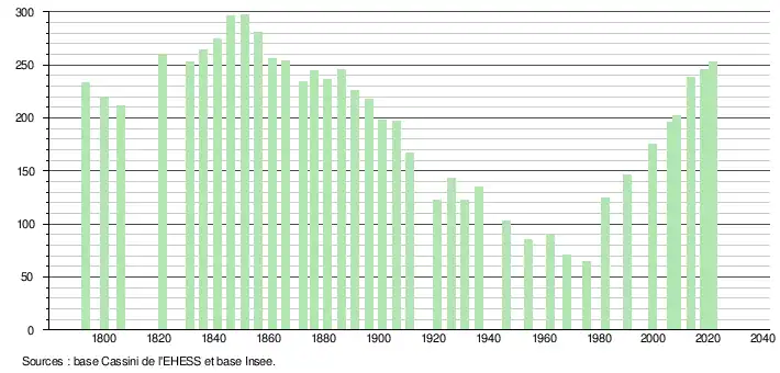 L'évolution du nombre d'habitants est connue à travers les recensements de la population effectués dans la commune depuis 1793. Pour les communes de moins de 10 000 habitants, une enquête de recensement portant sur toute la population est réalisée tous les cinq ans, les populations légales des années intermédiaires étant quant à elles estimées par interpolation ou extrapolation[13]. Pour la commune, le premier recensement exhaustif entrant dans le cadre du nouveau dispositif a été réalisé en 2008[14].
