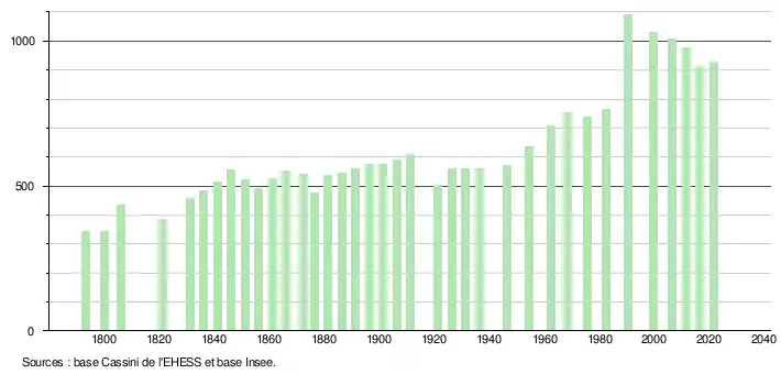 L'évolution du nombre d'habitants est connue à travers les recensements de la population effectués dans la commune depuis 1793. Pour les communes de moins de 10 000 habitants, une enquête de recensement portant sur toute la population est réalisée tous les cinq ans, les populations légales des années intermédiaires étant quant à elles estimées par interpolation ou extrapolation[22]. Pour la commune, le premier recensement exhaustif entrant dans le cadre du nouveau dispositif a été réalisé en 2006[23].
