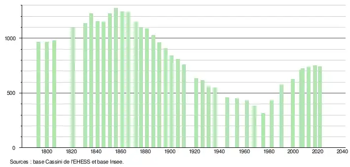 L'évolution du nombre d'habitants est connue à travers les recensements de la population effectués dans la commune depuis 1793. Pour les communes de moins de 10 000 habitants, une enquête de recensement portant sur toute la population est réalisée tous les cinq ans, les populations légales des années intermédiaires étant quant à elles estimées par interpolation ou extrapolation[15]. Pour la commune, le premier recensement exhaustif entrant dans le cadre du nouveau dispositif a été réalisé en 2007[16].