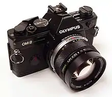Olympus introduit en 1975 avec l'OM-2 la mesure sur le film avec deux cellules dans la chambre du miroir, dirigées vers l'émulsion. Afin de permettre une estimation avant le déclenchement, le rideau de l'obturateur est peint d'une mire quadrillée noir et blanc.