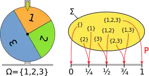 Par exemple, étant donné trois éléments 1, 2 et 3 avec des probabilités 1/4, 1/4 et 1/2, la valeur attribuée à {1, 3} est 1/4 + 1/2 = 3/4, comme dans le schéma à droite.