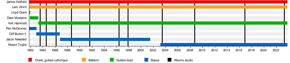 Metallica est un groupe de heavy metal américain originaire de Californie et considéré comme le plus grand groupe de metal de tous les temps. C’est également le groupe du style à avoir vendu le plus d’albums dans le monde. Formé à Los Angeles en 1981, le groupe est composé de James Hetfield (chant, guitare rythmique) et Lars Ulrich (batterie), ainsi que du guitariste Kirk Hammett (arrivé en 1983) et du bassiste Robert Trujillo, qui a rejoint le groupe en 2003. Les précédents membres du groupe incluent Dave Mustaine (après son exclusion, membre fondateur de Megadeth), les bassistes Ron McGovney (uniquement pour les démos), Cliff Burton (pour les trois premiers albums ; décédé en 1986) et Jason Newsted (prenant la suite de Burton jusqu'à son départ du groupe en 2001 et remplacé en 2003 par Trujillo). Le groupe a longtemps collaboré avec le producteur Bob Rock, qui a produit leurs albums de 1990 à 2003 et est devenu temporairement le bassiste studio intérimaire du groupe, entre le départ de Newsted et l'arrivée de Trujillo. Le groupe se forme au début des années 1980 lorsque Hetfield se rend à une annonce postée dans un journal local par le batteur Lars Ulrich.