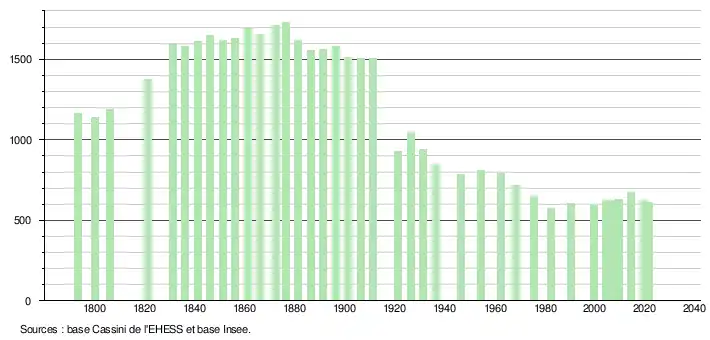 L'évolution du nombre d'habitants est connue à travers les recensements de la population effectués dans la commune depuis 1793. Pour les communes de moins de 10 000 habitants, une enquête de recensement portant sur toute la population est réalisée tous les cinq ans, les populations légales des années intermédiaires étant quant à elles estimées par interpolation ou extrapolation[25]. Pour la commune, le premier recensement exhaustif entrant dans le cadre du nouveau dispositif a été réalisé en 2004[26].