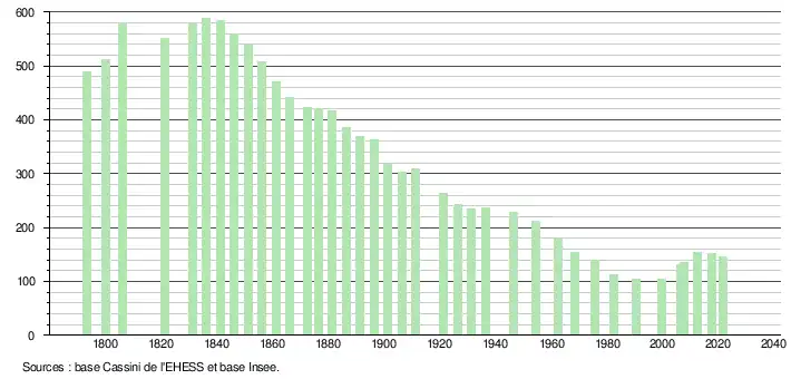 L'évolution du nombre d'habitants est connue à travers les recensements de la population effectués dans la commune depuis 1793. Pour les communes de moins de 10 000 habitants, une enquête de recensement portant sur toute la population est réalisée tous les cinq ans, les populations légales des années intermédiaires étant quant à elles estimées par interpolation ou extrapolation[17]. Pour la commune, le premier recensement exhaustif entrant dans le cadre du nouveau dispositif a été réalisé en 2007[18].