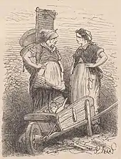 - L'ouvrière reprend sa place entre les deux baquets délaissés pour une journée ; et, faisant crier plus fortement son battoir, elle raconte sa promenade de la veille à la bonne ébahie, apportant sa cargaison de linge, etc.