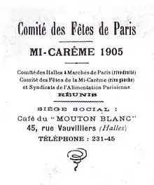 - Extrait de l'article Ce que Paris verra aujourd'hui, Un carnaval officiel auquel feront escorte deux mille flics, L'Humanité, 18 février 1913, page 1, 2e colonne. La réception a lieu le 18 février, Mardi Gras tombe le 4 et la Mi-Carême le 27.