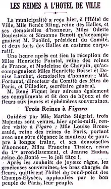 - La reine des reines de Paris pour 1934 a été élue hier, Le Matin, 5 mars 1934, page 5, 4e colonne. Voir l'article reproduit dans Commons.